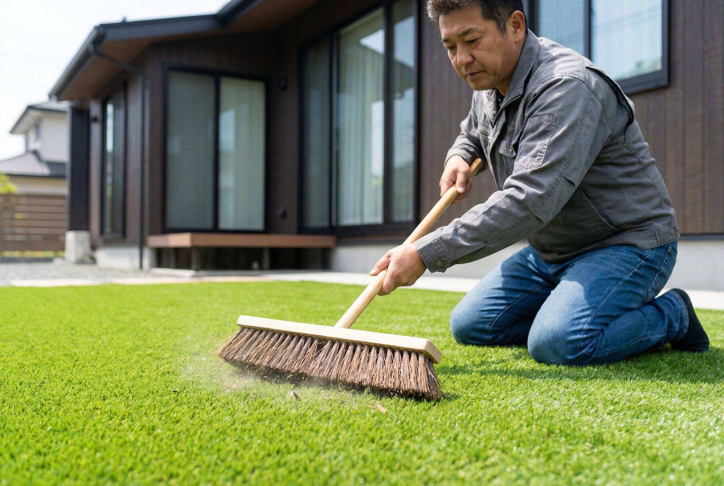 人工芝は「メンテナンスフリー」ではなく「ローメンテナンス」。正しいお手入れを続けることで、見た目の美しさと耐久性を長期間キープできます。
