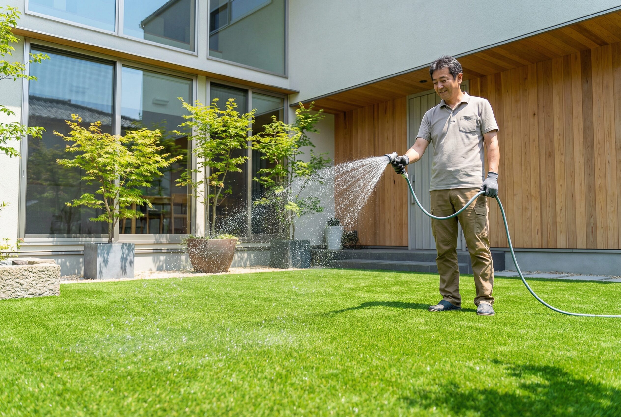 人工芝のメンテナンスは、「ブラッシング」「ゴミ拾い」「水洗い」のたった3ステップが基本。天然芝と比べてはるかに手間が少なく、年間の維持コストもほとんどかかりません。