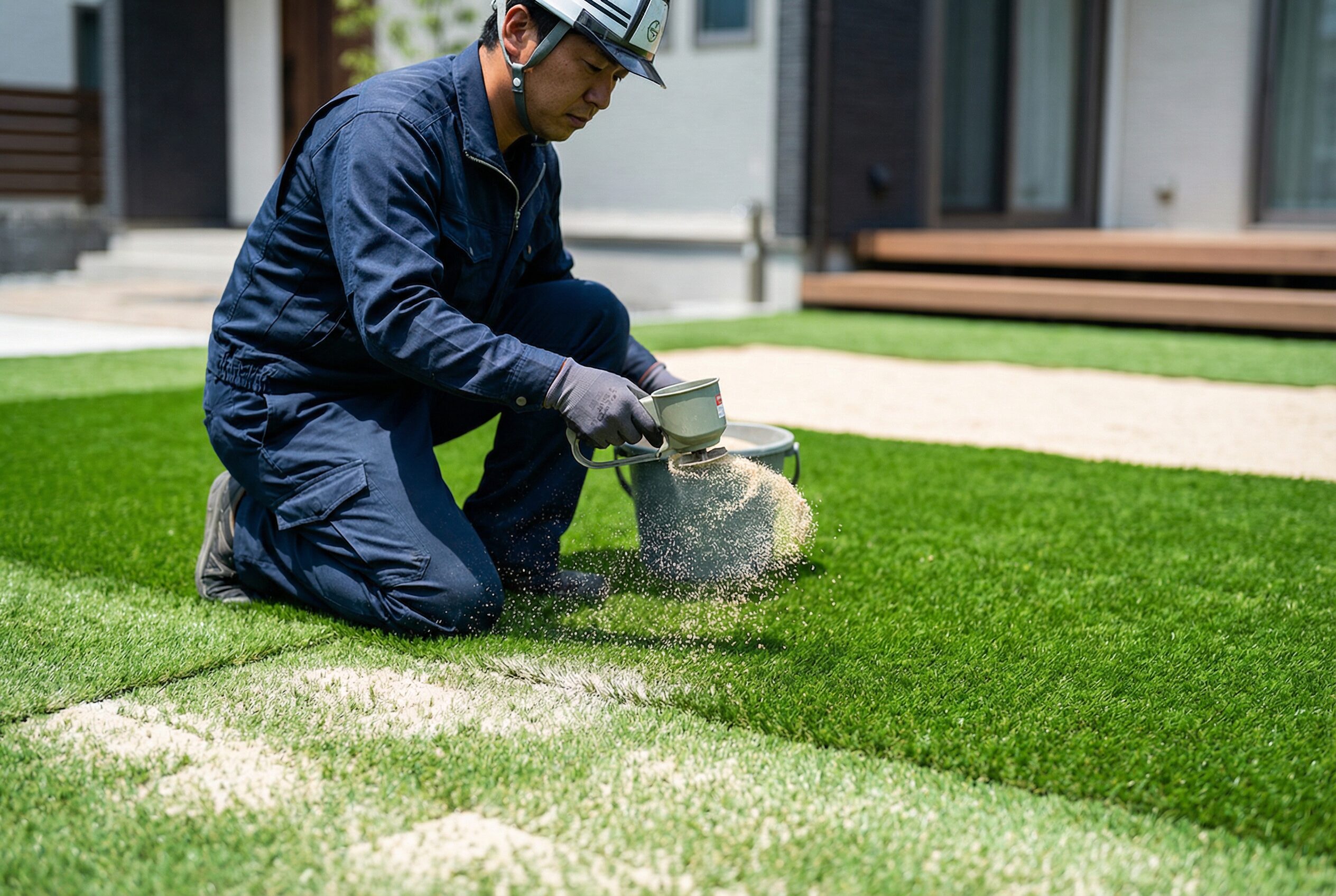 さらに、変色・芝葉の倒伏・下地の浮き・継ぎ目の開き・排水穴の詰まりという5つの劣化サインを定期的にチェックすることで、早期発見・早期対処が可能になります。珪砂の充填や重量物の定期移動、UV対策、防草シートの併用、プロの定期点検の活用といった5つの長持ちコツを実践すれば、7〜10年の耐用年数を12年以上に延ばすことも夢ではありません。